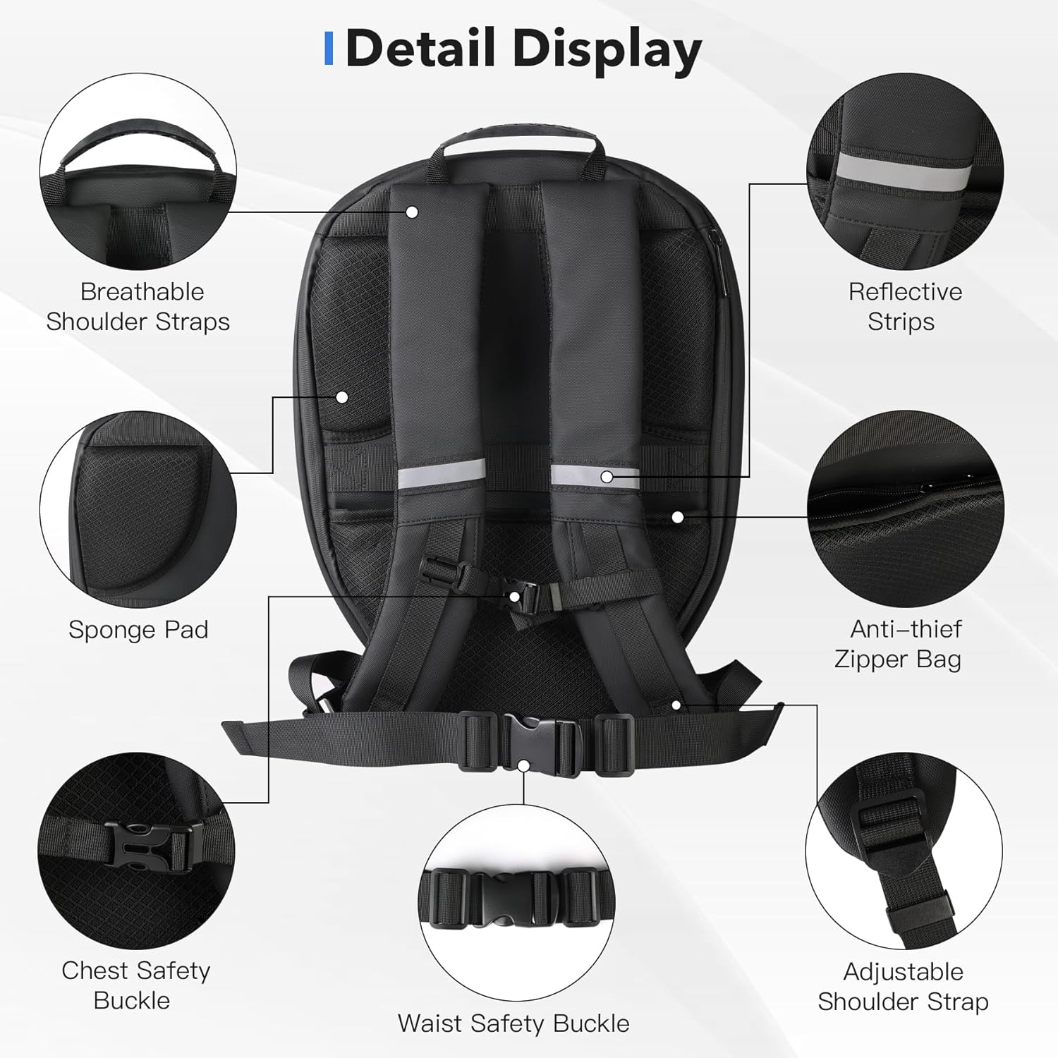 Waterproof materialMade of sturdy 3D Hard Shell waterproof material, free riding in any weather. | LED Full Color ScreenMade of 3D hard shell waterproof, scratch-resistant materials. | 2 PCS Safety BuckleThe chest and waist buckle can securely fix the backpack to ensure stable and safety. |